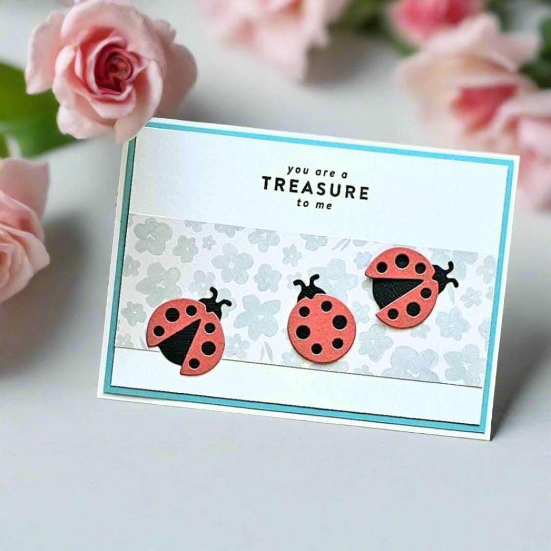 - Featuring red and black die-cut lady bugs and you are a treasure to me stamped.
