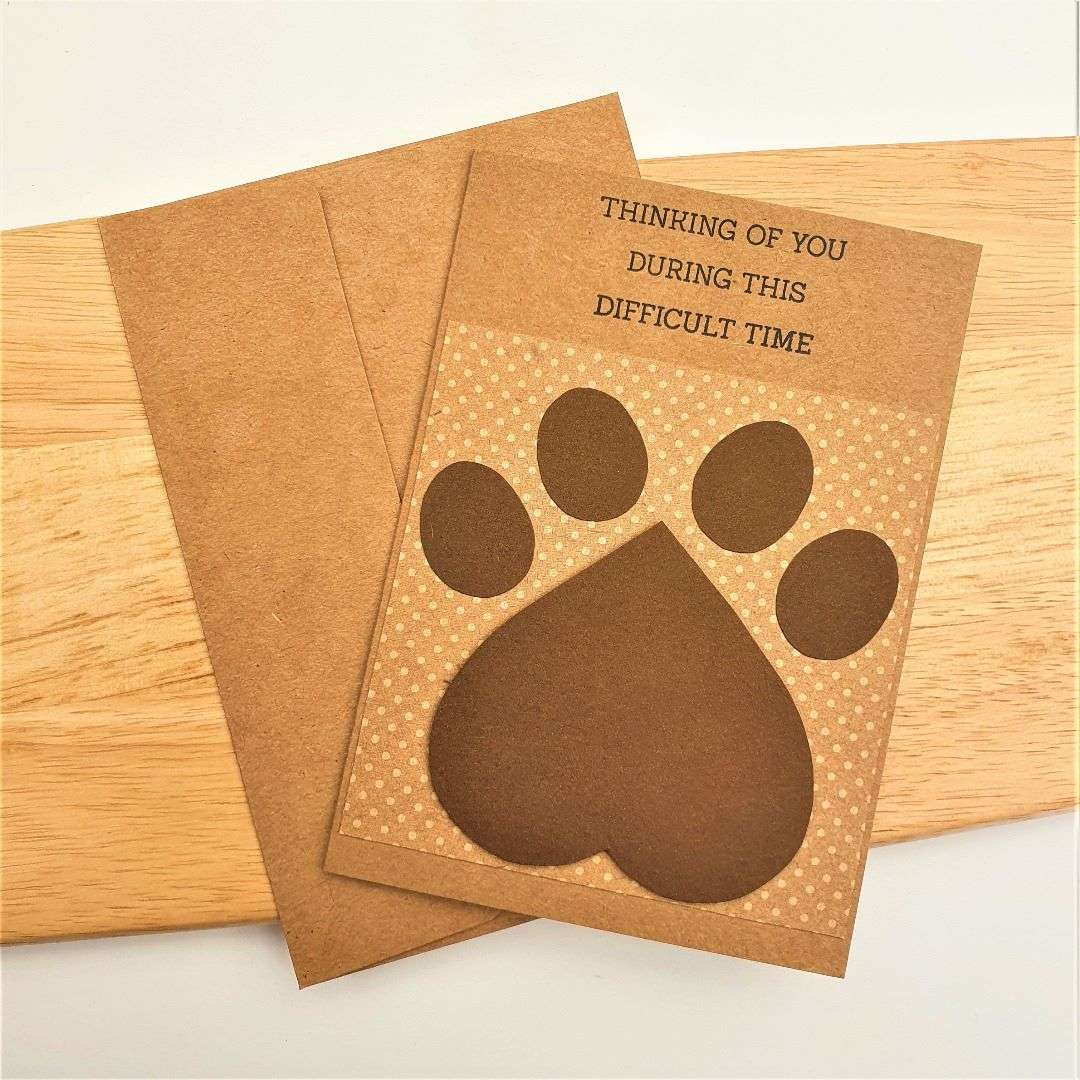 - Featuring a paw print on spotted background with the words thinking of you during this difficult time.