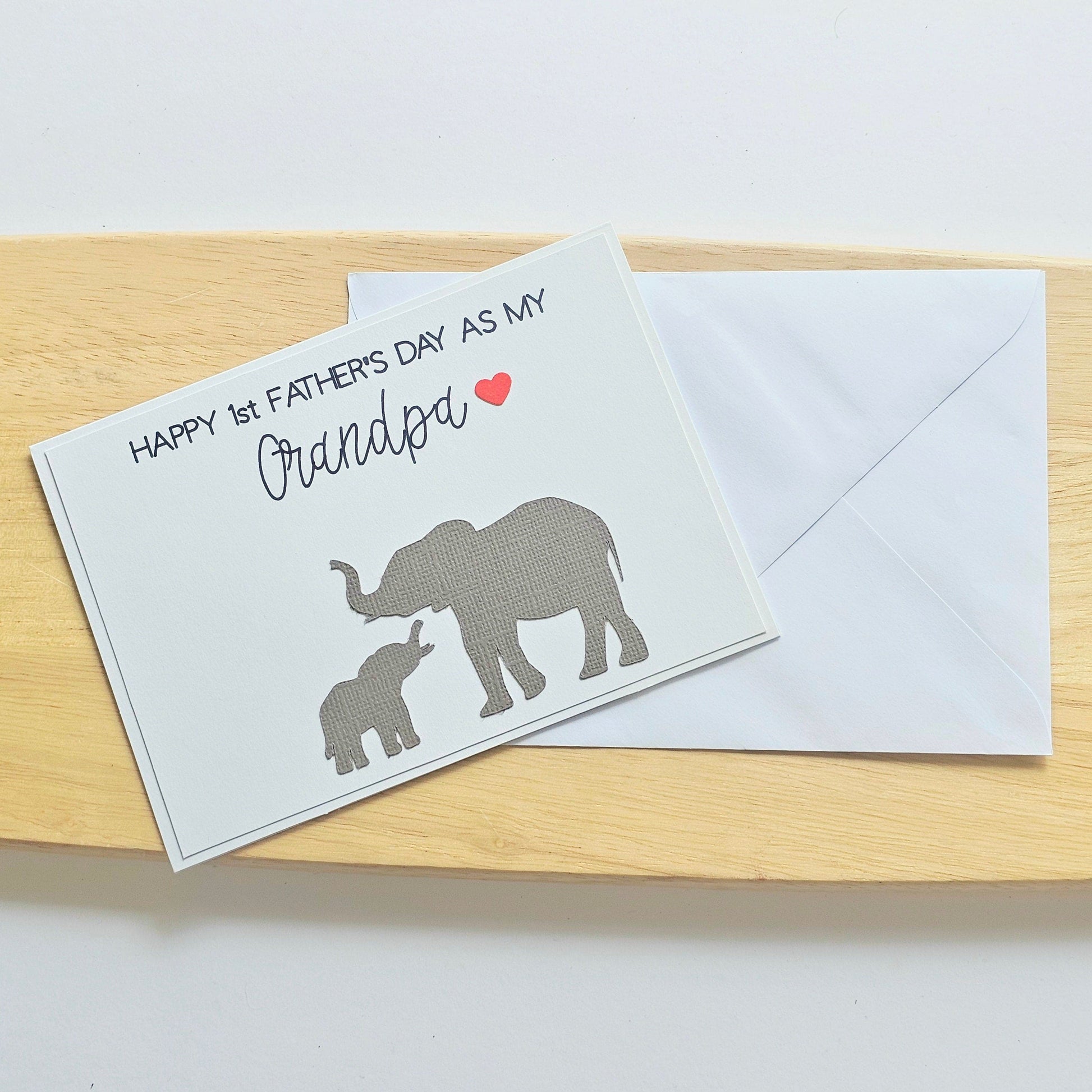 - This Fathers Day Card for Grandpa features a large elephant with a baby elephant design, along with the wording “Happy 1st Father’s Day as my Grandpa” and a red heart detail.