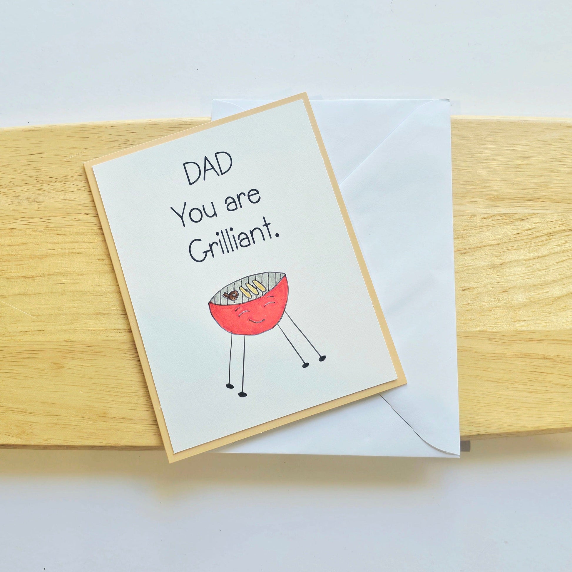 - This funny Fathers Day card features a red BBQ grill illustration with the pun “Dad, you are Grilliant.”