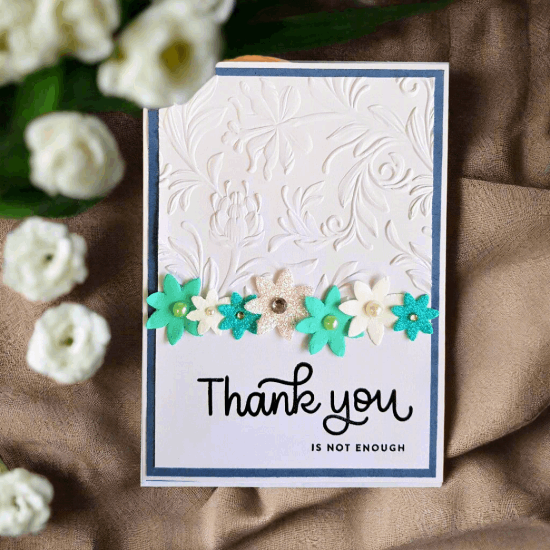 - This card is made of white card stock with a blue background and an embossed floral pattern up the top with a line on teal and white flower embellishments and the words 'Thank you is not enough' stamped in black.