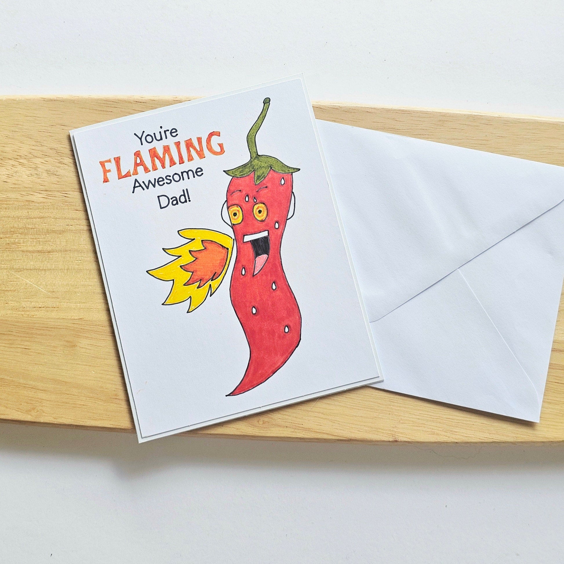 - Features a hand-drawn red chilli illustration breathing fire with the wording “You’re Flaming Awesome Dad.”