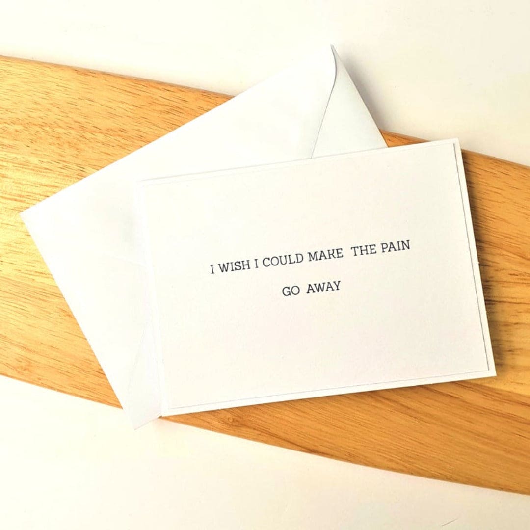 - This Simple card is made of quality white card stock with the words "I WISH I COULD MAKE THE PAIN GO AWAY" Stamped in black ink across the centre of the card.